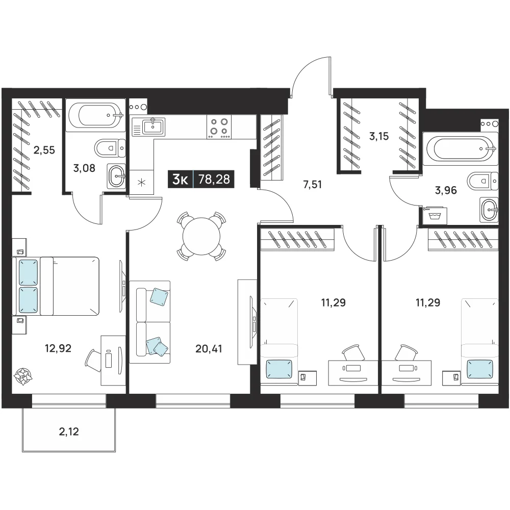3-комнатная 78.28 м